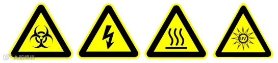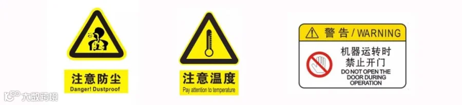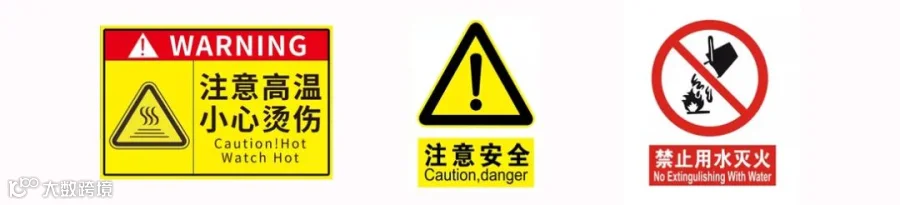 ● 警告标识:提醒人员注意潜在危险,基本形式为黑色正三角形边框,黑色图形,黄色背景[k]。