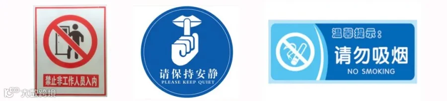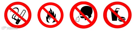 ● 禁止标识:禁止不安全行为,基本形式为红色带斜杠圆边框,黑色图形,白色背景[k]。