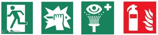 ● 提示标识:提供位置或方向信息,基本形式为矩形边框,白色图形文字,绿色背景;消防设施提示标识背景为红色[k]。