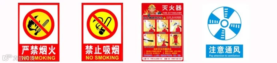 应设置“严禁烟火”“禁止吸烟”等禁止标志;配备灭火装置标志;增设“注意通风”“注意防潮”“防止啮齿动物入侵”等警告标识[k]。