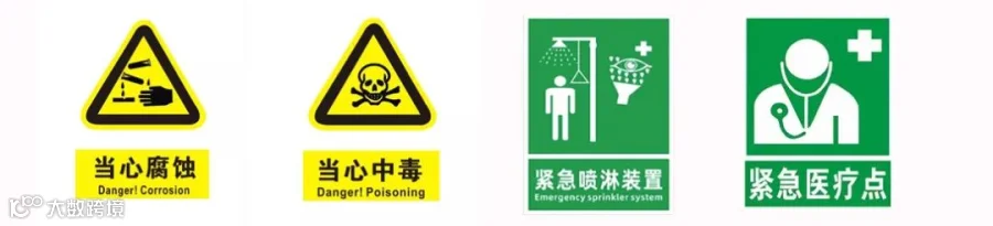 应设置灭火装置消防标志,必要时设“禁止用水灭火”标志;设置“按要求移取试剂”指令标志;配备“当心中毒”“当心滑倒”“当心腐蚀”“当心物品滑落”“当心试剂溢撒”“当心尖锐物品”等警告标识;设置“注意通风”“紧急喷淋”“医疗急救”以及“必须穿工作服”“必须戴防护口罩”“必须戴护目镜”“必须戴手套”等指令标志;对空气洁净度有要求的区域设“注意防尘”提示标志;温湿度敏感区域设“注意观察温度”“注意观察湿度”提示标志[k]。