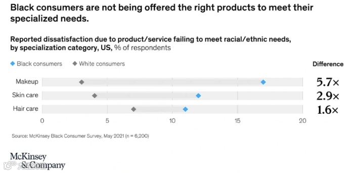 非传统的美容类型、不同种族、不同性别,都应该是美妆个护产品应该包容进去的群体。麦肯锡报告称,黑人品牌仅占行业收入的2.5%,但黑人消费者在美容上的支出却占11%,黑人消费者对护肤、护发、化妆品等产品的不满可能性比其他肤色可能高出3倍。