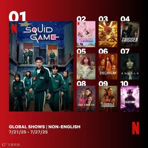 在非英语剧集方面,奈飞原创韩剧《鱿鱼游戏》第三季持续保持热度。根据奈飞官方平台“TUDUM”公布的“TOP 10”收视数据,《鱿鱼游戏3》在7月21日至27日期间以460万次观看次数和2859万小时播放时长,连续第五周位居非英语节目榜首[k]