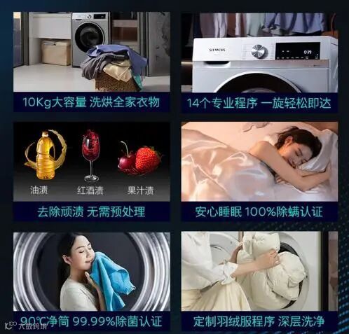 购机建议:要是家庭居住地区气候潮湿,经常需要烘干衣物,注重洗衣机的除菌、清新功能以及内筒清洁,同时想享受国家补贴,这款西门子10公斤洗烘一体滚筒洗衣机是不错的购机方向。