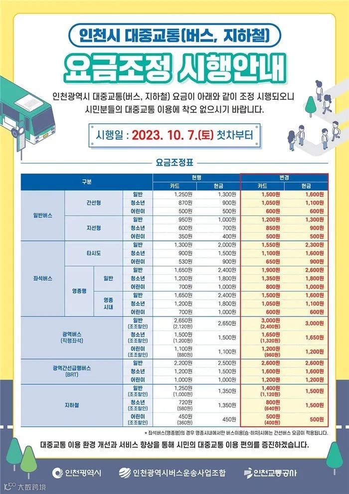 自2025年10月7日起,仁川市公交车、地铁及客轮等公共交通费用将全面上调[k]。此次调整为8年来首次,涉及市内公交、广域公交、地铁及岛屿客轮等多种交通方式[k]。