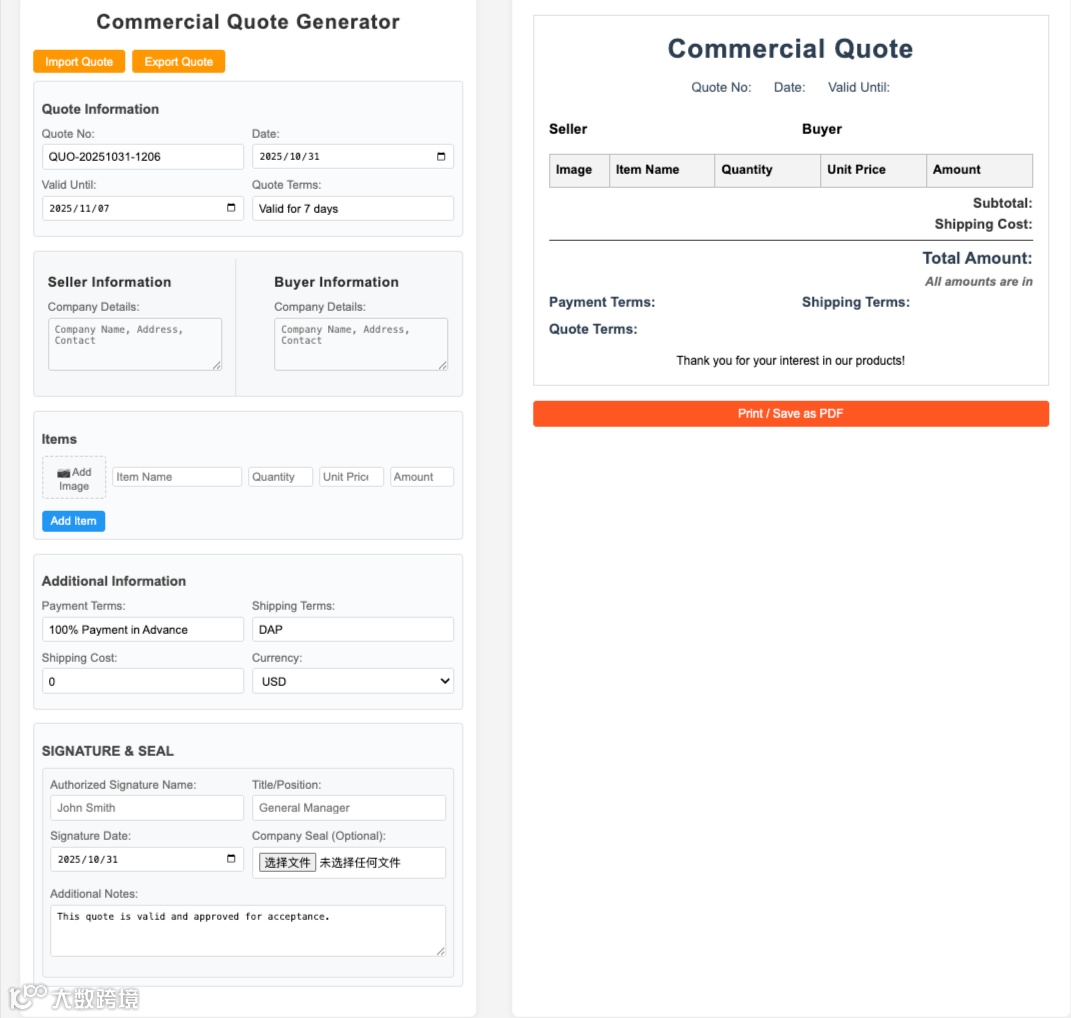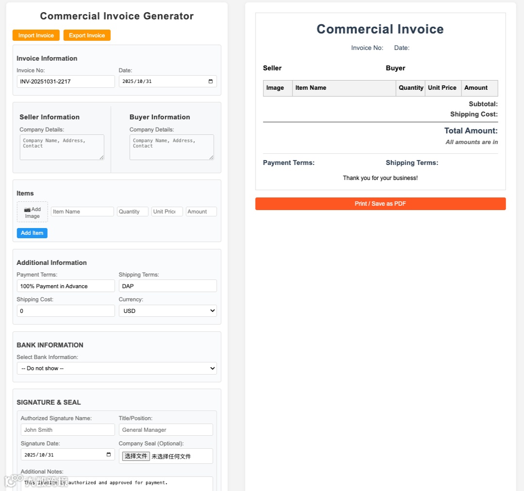 商业发票生成器:新增签名与印章功能,可按需添加图片;