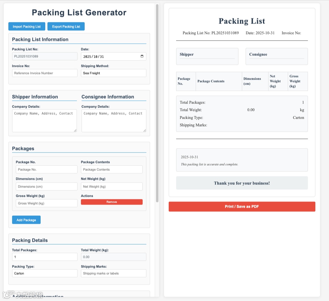 简易装箱单生成器:快速填写,一键导出。