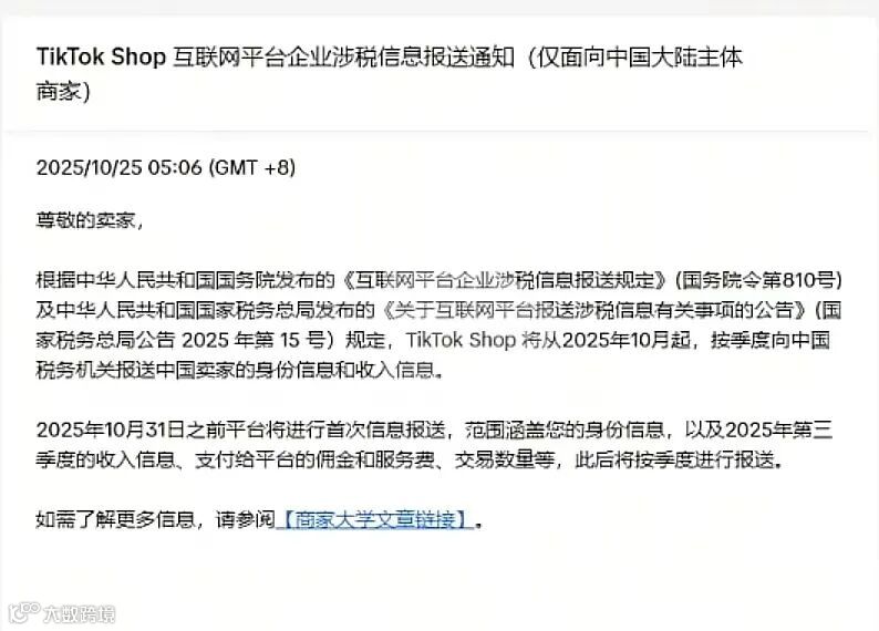 10月24号TK官方发布的消息,针对全托管和跨境店卖家需要向国家申报税务信息,10月31日前,平台首次报送你的身份信息以及第三季度的收入信息,此后,平台将在每个季度结束的次月内(1月、4月、7月、10月)报送上一季度涉税信息。