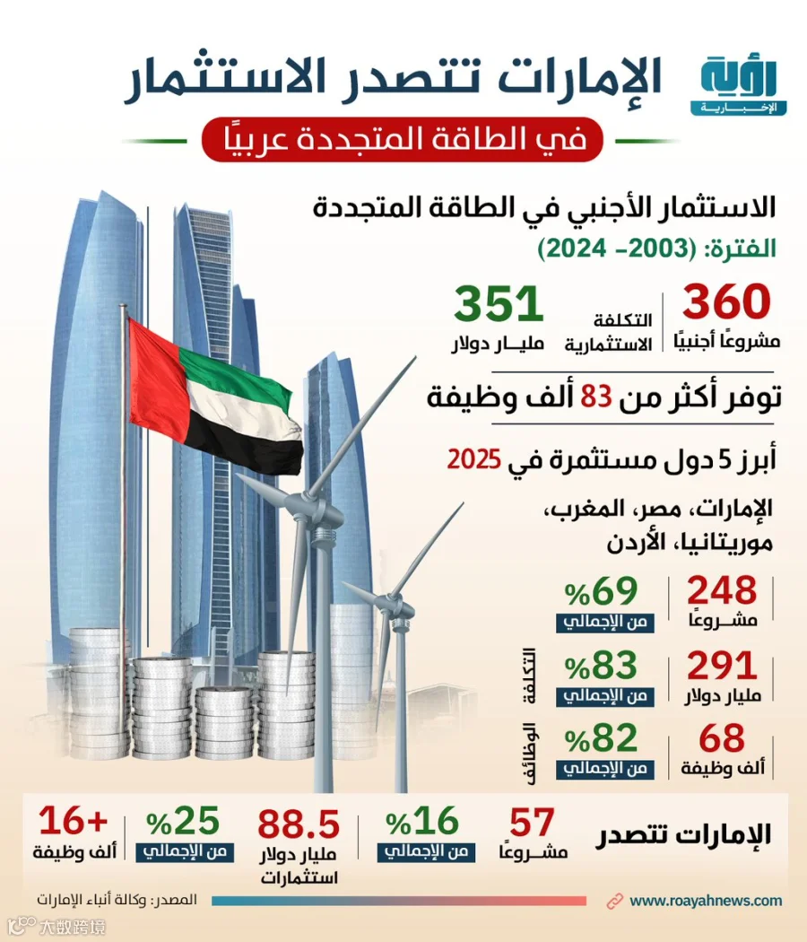 这份在科威特总部发布的2025年第二份电力和可再生能源行业报告指出,阿联酋、埃及、摩洛哥、毛里塔尼亚和约旦五国共吸引248个外资项目,占总数69%,投资额约2910亿美元,占83%,提供约6.8万个就业岗位,占82%。