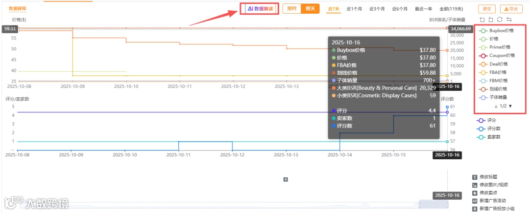 上排数据中,我们可以看到包括黄金购物车,prime,FBA,FBM等多种模式下的产品价格以及价格走势。下排数据可以看到评分数,卖家数等消费者市场数据。