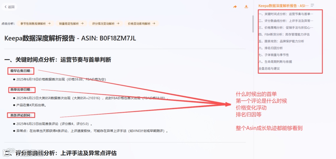 通过Keepa AI数据解读,我们可以将整个Asin的成长轨迹一目了然,包括它什么时候出的首单,第一个评论是什么时候发生的,一路以来的价格变化浮动,以及排名归因等等。