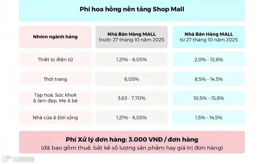 报道称,这不是个例。自 2025 年 4 月以来,TikTok Shop 已连续三次上调费用。第一次是在 4 月 1 日,平台将普通店铺的佣金从 2-3% 提高到 3-4%,商城店铺则从 4.54-5.78% 上调至 6.05-7.7%。第二次调整发生在 7 月 18 日,部分热门品类如时尚、美妆的佣金进一步飙升至 10-12%,再加上支付处理费、服务费等,卖家实际承担的平台成本比之前增加了 2 到 3 倍。到了 10 月 27 日的第三轮,新增了每单 3000 越南盾的固定费用,直接让低价引流策略变得难以为继。