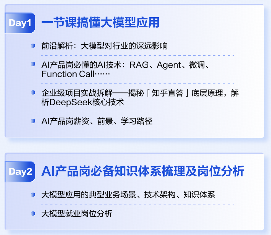 从大模型原理出发,到真实的商业案例,2天时间,把AI大模型原理、主流AI解决方案、典型应用场景、未来的趋势与发展全讲透了!帮助你从0~1建立AI产品能力!