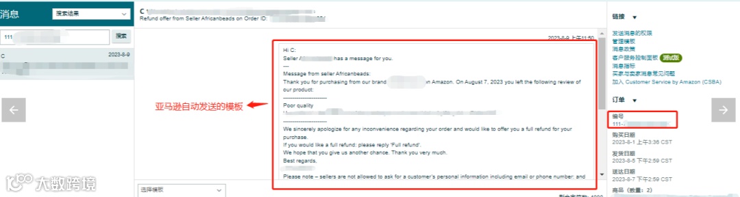 邮件发送后,可以在buyer-seller message里看到原始订单号,如果觉得模版内容不好,可以重新按照自己的话术重新给买家发送邮件: