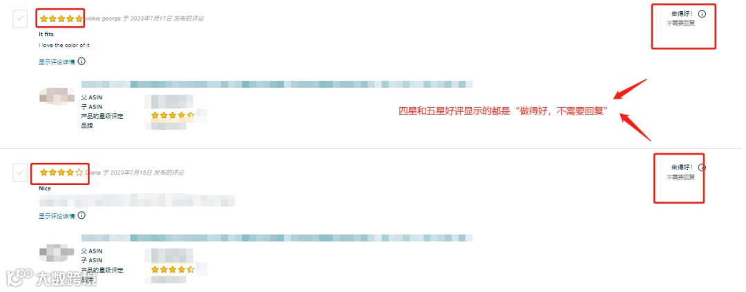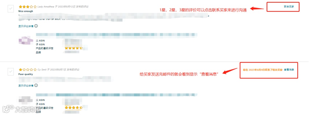 换言之,就是1星、2星和3星的评论才可以联系买家,4星和5星的好评无法联系买家,相关示例如下: