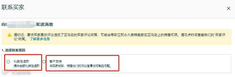 如果品牌所有者需要收集其他信息,然后才能帮助买家,则请使用【买家支持】作为联系原因。系统将自动生成一封电子邮件,请求买家允许通过买家与卖家消息服务联系。点击【发送】。