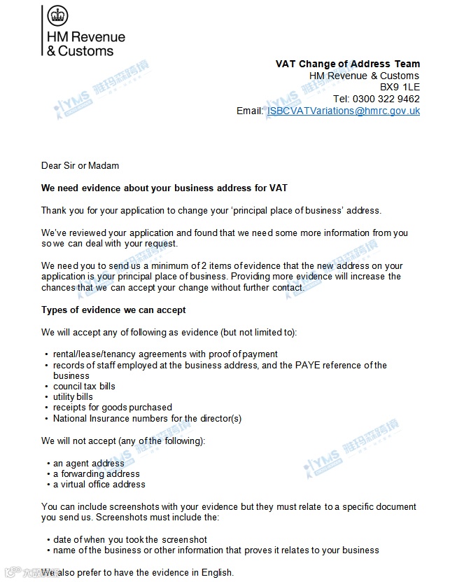 关于您增值税(VAT)地址变更的事宜,我们需要获取有关您的企业地址的证据。感谢您提交了关于更改您的“主营业务地点”地址的申请。我们已经审查了您的申请,发现我们需要您提供更多信息,以便处理您的请求。