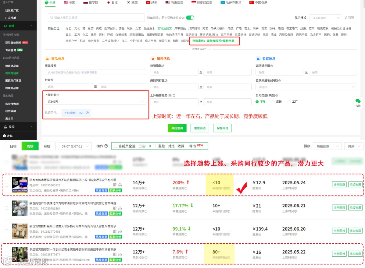 ①挖掘低竞争高需求的品:精铺要聚焦1-2个类目,集中精力找竞争较低、需求高的产品,我们可以通过店雷达跨境商机榜挖掘,例如主做宠物类目下的猫狗用品,上架时间尽量选择近一年的商品,处于成长期、发展空间大;同时优选趋势上涨,但采购同行更少的产品,竞争程度小,成为爆品的潜力更大。
