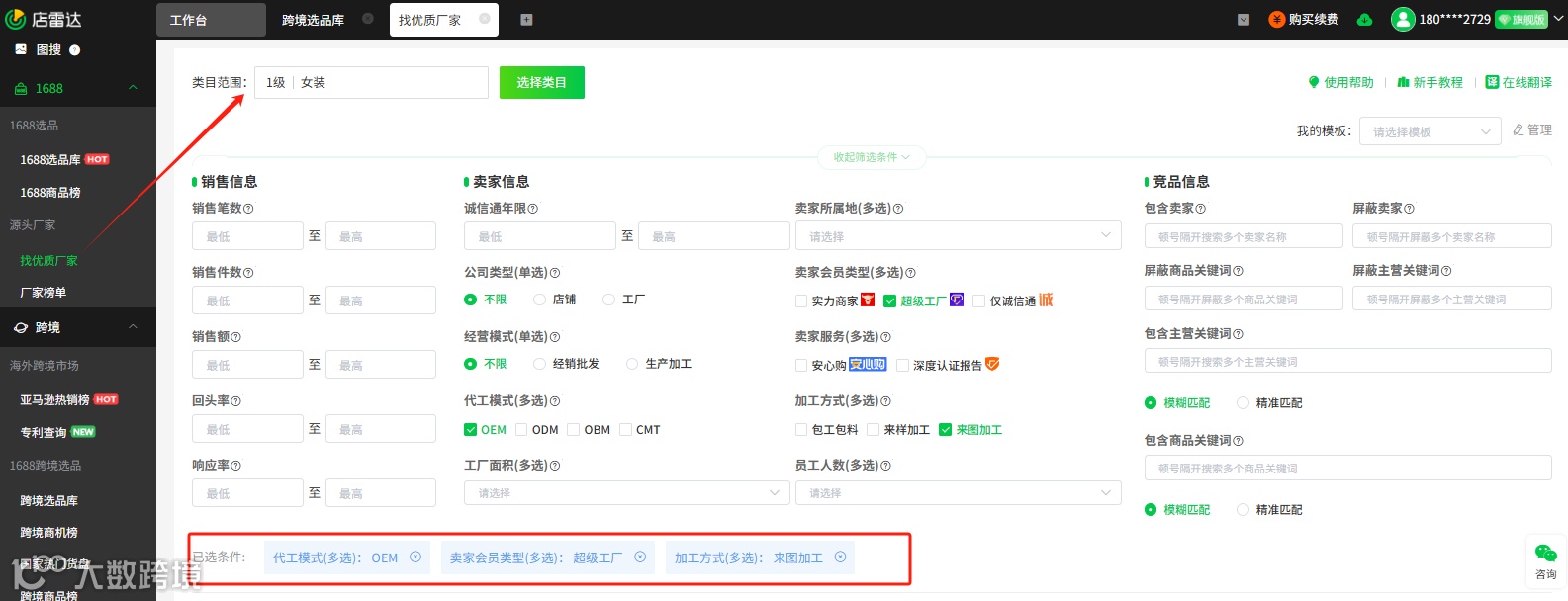 通过店雷达1688源头厂家,卖家可根据条件筛选出目标类目下的源头厂家,例如筛选出女装类目、OEM代工模式、来图加工、厂房面积1000平米以上的超级工厂,再分析供应商的产能规模、经营状态、主营类目专注度、响应率等指标,判断供应商是否具备成为“深度合作伙伴”的潜质。