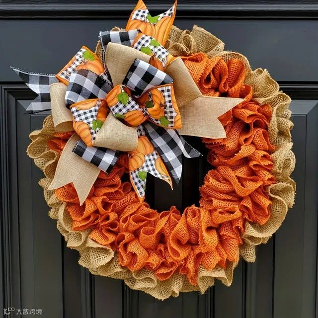 1pc Autumn Thanksgiving Front Door Decoration Wreath Yellow Burlap Bow Ribbon Wreath Autumn Front Door Wreath Autumn Porch Decoration Fall Decor
