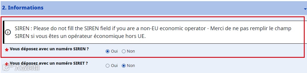 1. 仅支持有效SIREN号申请法国EORI,且只能成功申请一次;