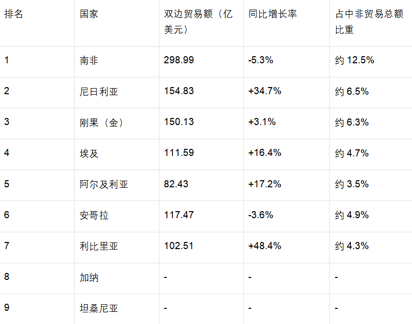 :2025 年 1-7 月,南非以 298.99 亿美元的双边贸易额保持中国在非洲第一大贸易伙伴地位,其中中国对南非出口同比微降 0.1%。尼日利亚双边贸易额为 154.83 亿美元,中国对尼出口同比大幅增长 39.8%。埃及双边贸易额为 111.59 亿美元,中国对其出口增长 16.7%。阿尔及利亚双边贸易额为 82.43 亿美元,中国对其出口增长 17.9%。 - 1-5 月数据