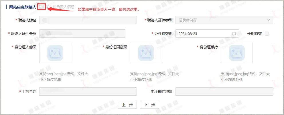 7、按照要求填写网站安全负责人、紧急联络人,可以与主体负责人保持一致;