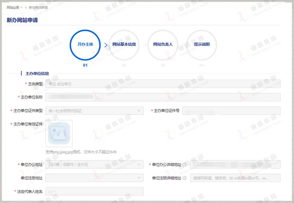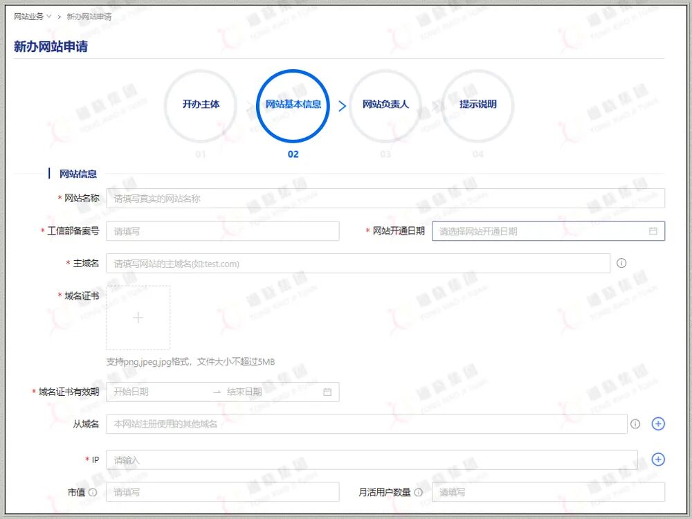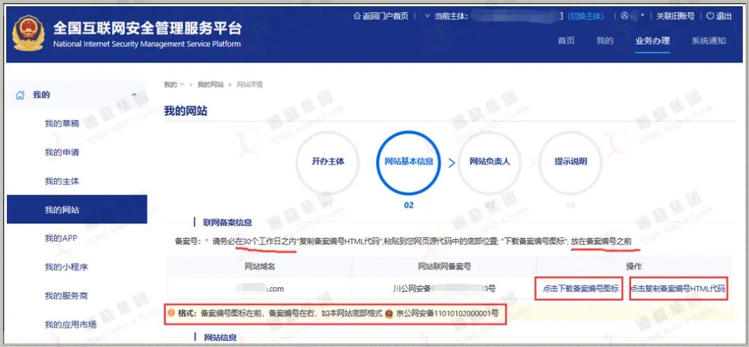 新增网站→填写主体(和上面主体部分保持一致)、网站主体负责人信息;