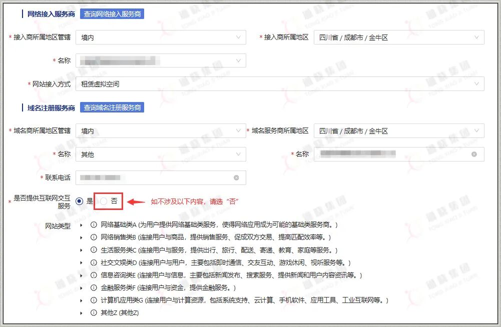 是否提供交互服务:涉及展示的网站类型选“是”,不涉及的选“否”,普通官网类型不属于交互服务。