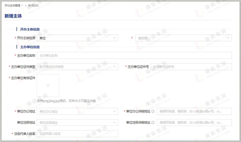 2、登录后点击右上角业务办理→新增主体,按照要求填写主体和负责人信息,提交审核;