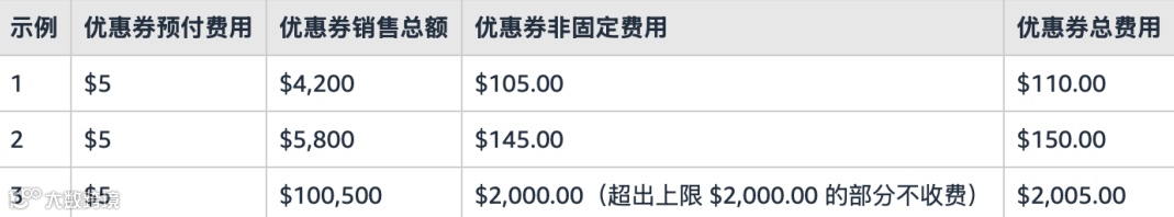 可变费用:按优惠券促成销售额的 2.5% 收取,单张优惠券的可变费用最高不超过 2000 美元。
