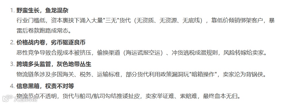 今天,小编也来让DeepSeek用犀利、尖锐的语言锐评跨境物流服务商频繁暴雷的行业乱象,直击乱象根源,探寻破局之道,希望对跨境从业者有所启发: