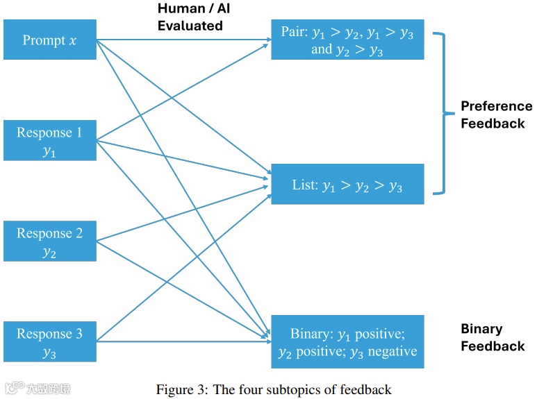 反馈类型涵盖偏好反馈与二元反馈、成对反馈与列表反馈、人类反馈与AI反馈[k]。