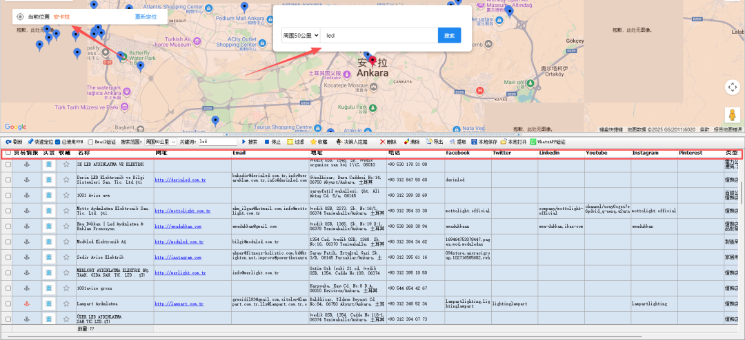 如:搜索产品关键词‘led’,定位城市‘安卡拉’,就可以获取到公司名称,网站,邮箱,电话及社交媒体的联系方式。