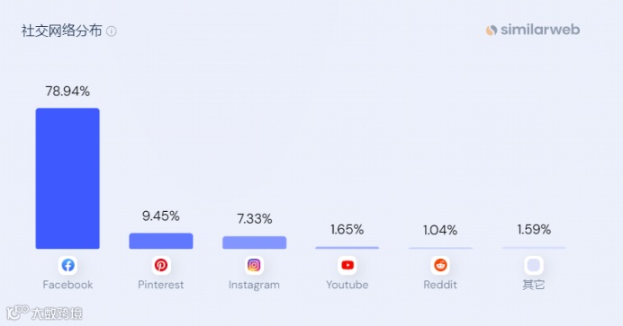 根据similarweb数据显示,Ruggable从Facebook、Pinterest、Instagram获取流量的比重分别为78.94%、9.45%、7.33%,以视觉图片搭配文字为主要宣传内容,借助这些社交媒体的流量,获取精准客户群体。