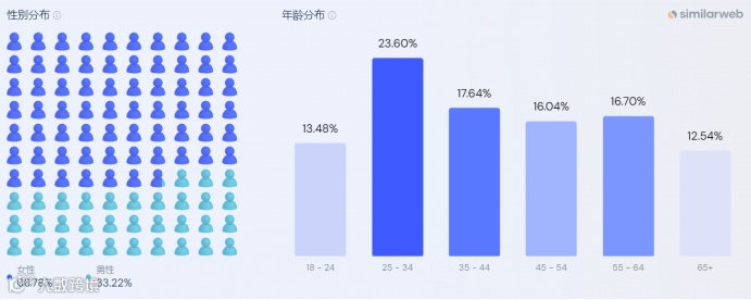 其中25—34岁的年轻用户占23.60%,而Ruggable受众群体中,66.78%为女性,33.88%为男性,Ruggable深受年轻女性用户青睐,根据品牌受众,布局恰当的营销渠道。