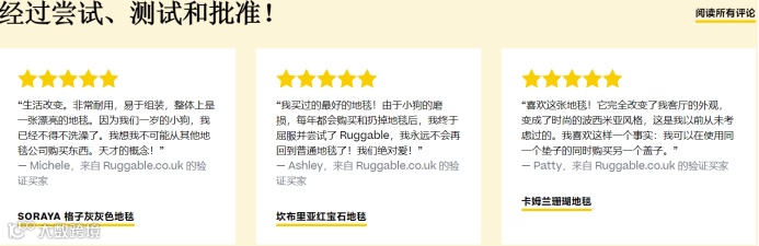 另外,Ruggable在网站展示真实购买用户的评论,真实消费用户的评价传达出使用后的真实情感,与其他消费者产生情感和痛点共鸣。