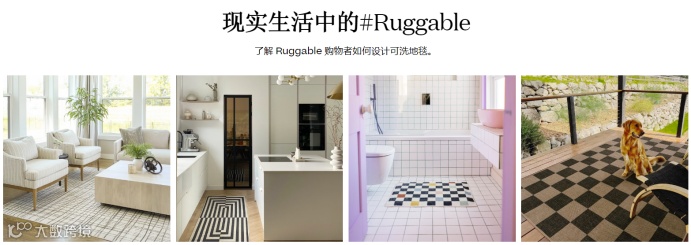 Ruggable品牌专设“现实生活中的#Ruggable”板块,以图片的形式向进入网站的用户展示Ruggable地毯在家里不同位置的呈现效果。
