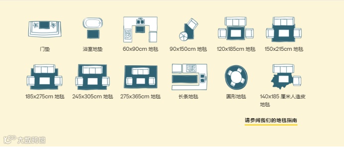在选择客厅、餐厅、厨房、卧室、走廊、户外等合适尺寸地毯时,Ruggable品牌还专门提供了参考指南。