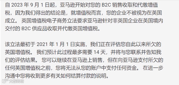 与此同时,还有许多卖家发现他们在亚马逊英国站的资金被冻结,还收到了亚马逊平台的通知。