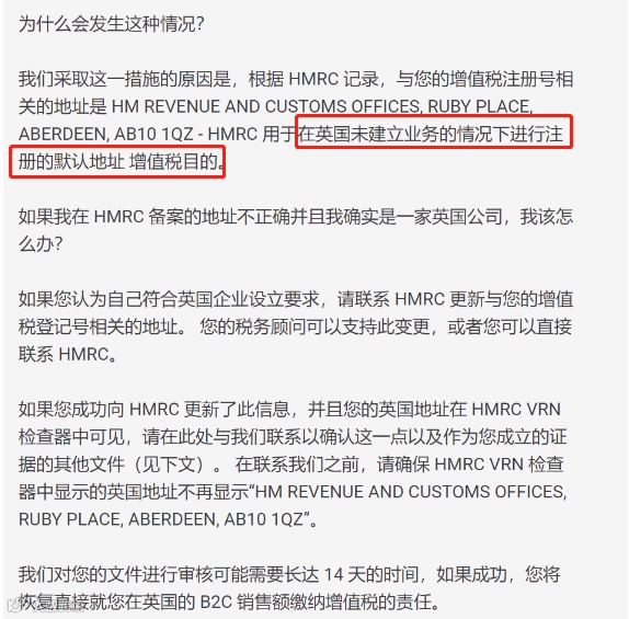 另一种是卖家用英国或北爱尔兰本土居住者的身份在英国注册公司,用NI NUMBER(英国社保号)和居住证申请VAT,但之后将公司法人变更为中国法人,但法人变更后并未重新申请VAT,这也会导致原VAT失效,地址也会变成HRMC。