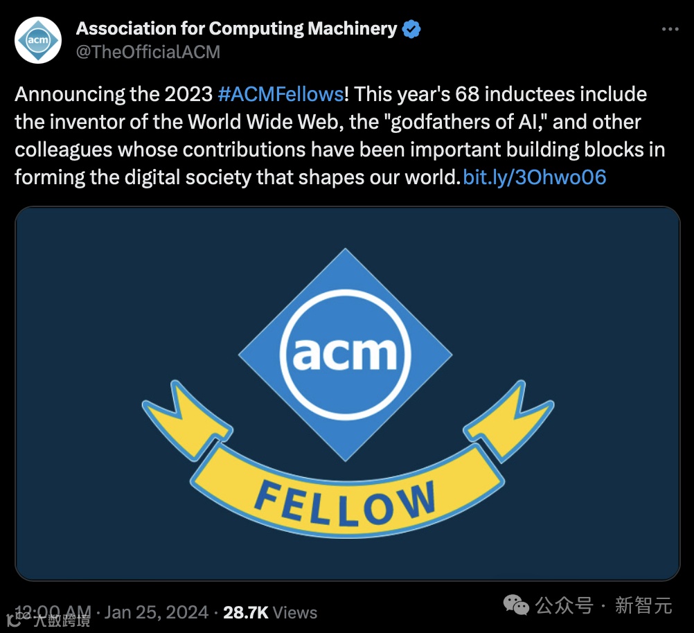 【新智元导读】2023年ACM Fellow名单正式公布,共68位全球顶尖计算机科学家当选。深度学习三巨头Geoffrey Hinton、Yoshua Bengio、Yann LeCun,以及万维网之父Tim Berners-Lee均名列其中。另有包括马维英、高剑峰在内的14位华人学者入选,彰显中国在全球计算领域日益增强的影响力[k]