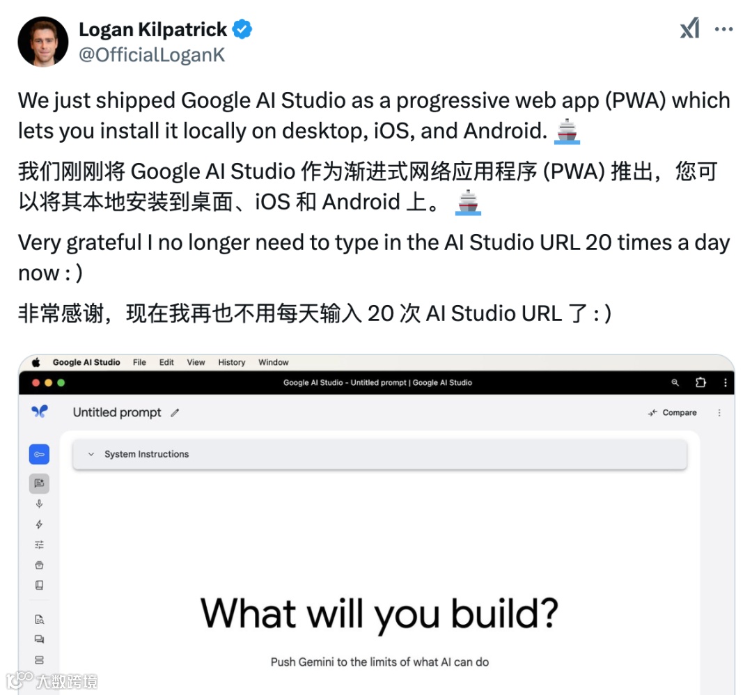 谷歌AI Studio产品负责人Logan Kilpatrick宣布,PWA版现已上线,用户可将其安装在电脑、iOS及安卓设备上,像使用原生应用一样便捷启动[k]。