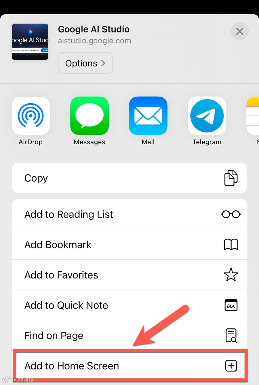 在弹出菜单中选择“添加至主屏幕”,确认后即可在手机桌面生成快捷方式[k]。