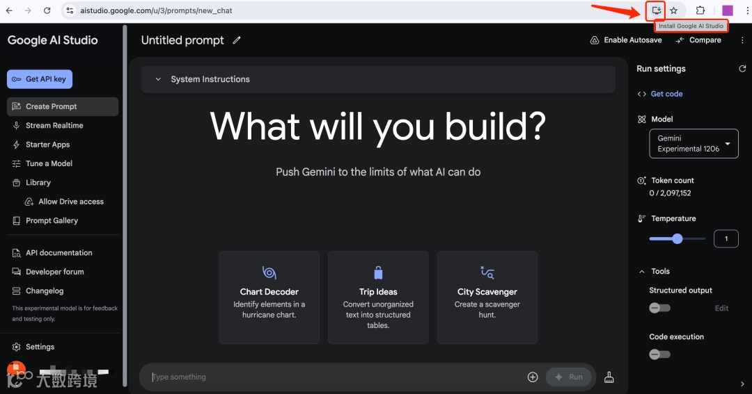 在Chrome中打开AI Studio官网,地址栏右侧将出现“下载”图标,提示“安装谷歌AI Studio”[k]。