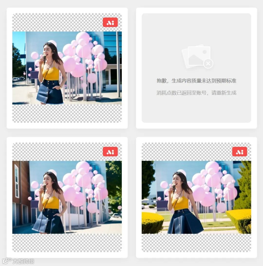 测试中输入“穿着牛仔短裙”扩展下半身,生成结果存在动作生硬、背景融合不佳等问题,细节处理仍有提升空间[[k]]。