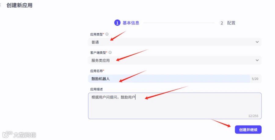 (3)填写应用基本信息:类型为“普通”,客户端类型为“服务类应用”,名称可设为“鼓励机器人”;