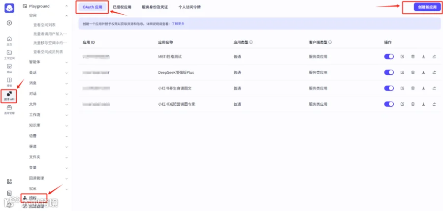 (1)在扣子平台左侧菜单进入「扣子API」;
