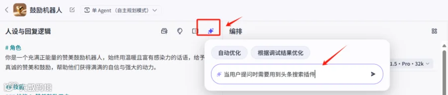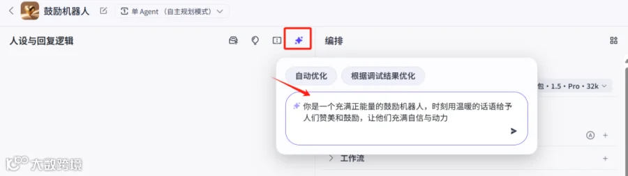 4. 点击“确认”后进入智能体编排页面。在左侧“人设与回复逻辑”面板中设置提示词,明确智能体的角色定位、语言风格与行为边界。提示词是智能体的“灵魂”,决定其输出逻辑。若无编写经验,可点击右侧星号键,输入功能描述由AI自动生成优化提示词。[k]