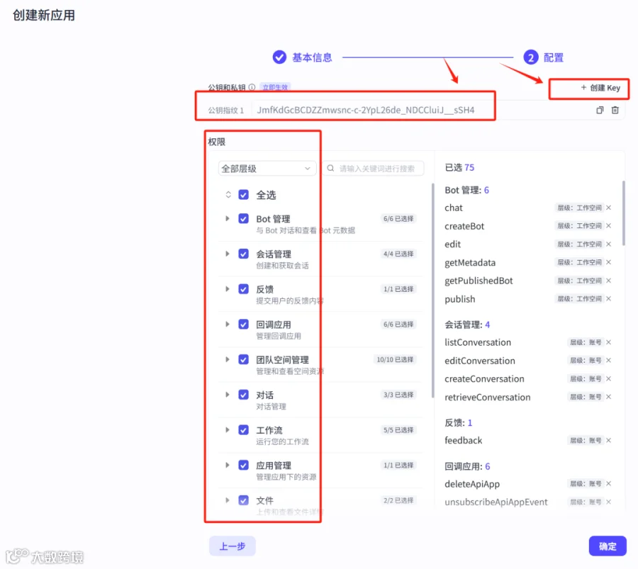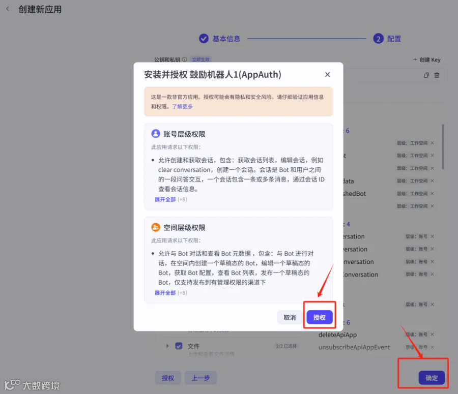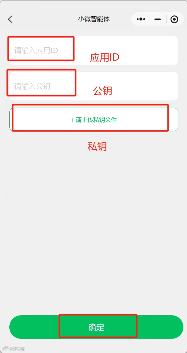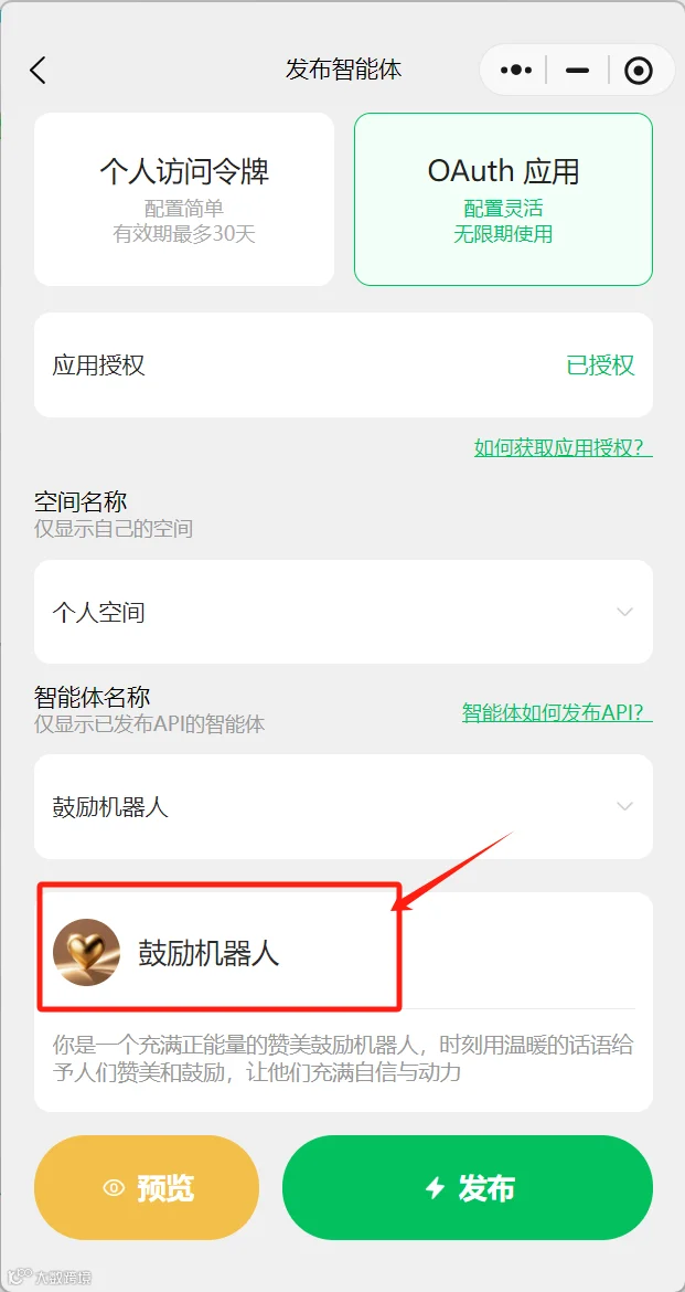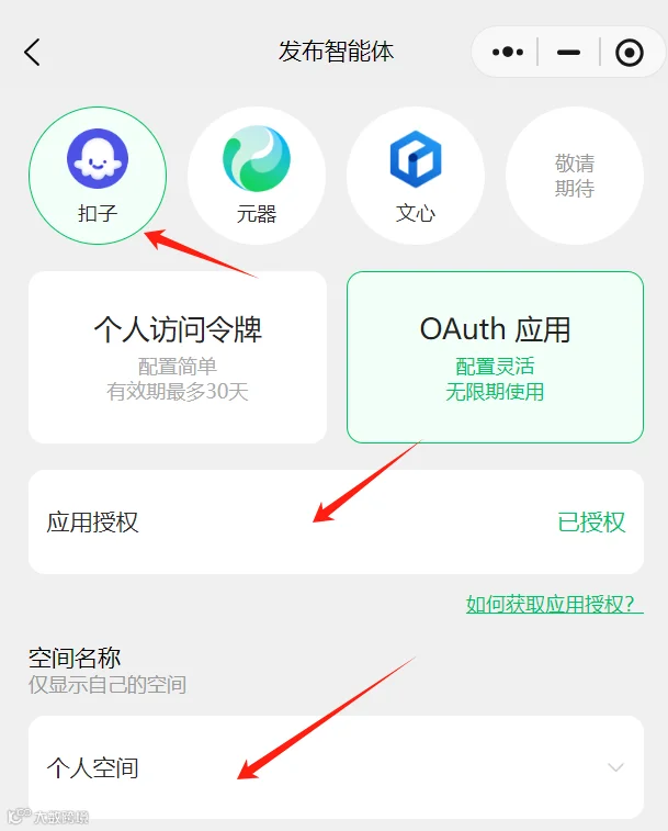 获取应用ID、公钥和私钥后,打开微信小程序搜索【小微智能体】,点击“发布智能体”,选择“扣子-OAuth应用-应用授权”,上传前述信息并确认。[k]